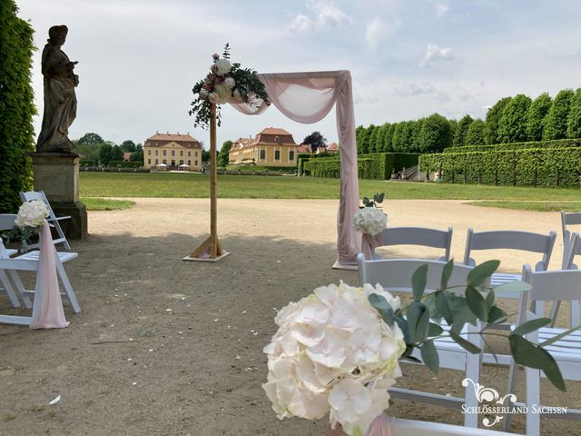 Wir bieten Ihnen eine romantische Kulisse für Ihre Freie Trauung im barocken Gartenambiente unter freiem Himmel im sogenannten Rundsaal. Sie und Ihre Gäste haben einen hervorragenden Blick ins Obere Orangenieparterre auf der einen Seite und über das Elbtal auf der anderen Seite.