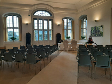 Der Gesellschaftsraum im Westpavillon der Oberen Orangerie ist der richtige Ort für eine Feier im kleineren Rahmen. Von hier aus betreten Sie direkt das herrlich blühende Obere Orangerieparterre.